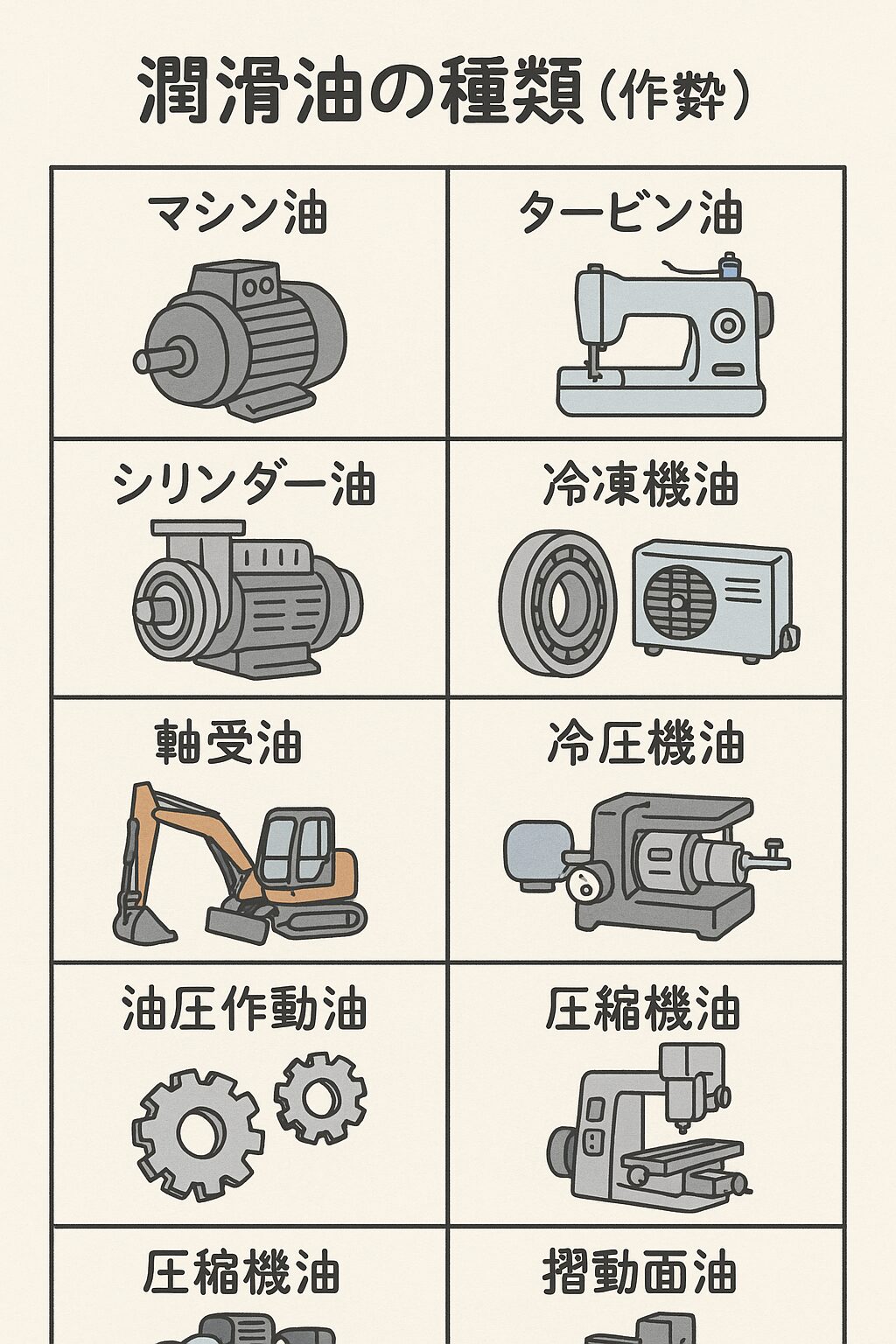 - ポイント:高い油膜保持力と防錆性、粘着性が求められる。油圧作動油との兼用タイプもあり。